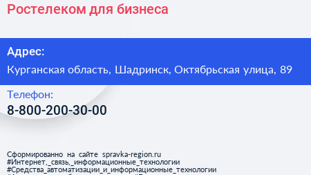 Ростелеком для бизнеса по адресу Курганская область, Шадринск, Октябрьская улица, 89 в дальнейшем Организация, размещена в следующих категориях: