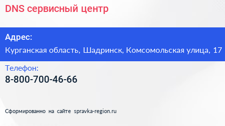 DNS, сервисный центр по адресу Курганская область, Шадринск, Комсомольская улица, 17 в дальнейшем Организация, размещена в следующих категориях: