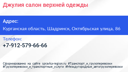 Джулия, салон верхней одежды по адресу Курганская область, Шадринск, Октябрьская улица, 86 в дальнейшем Организация, размещена в следующих категориях: