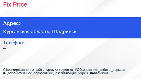 Fix Price по адресу Курганская область, Шадринск, в дальнейшем Организация, размещена в следующих категориях: