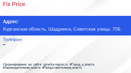 Fix Price по адресу Курганская область, Шадринск, Советская улица, 75Б в дальнейшем Организация, размещена в следующих категориях: