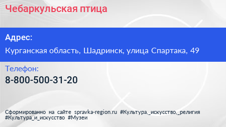 Чебаркульская птица по адресу Курганская область, Шадринск, улица Спартака, 49 в дальнейшем Организация, размещена в следующих категориях:
