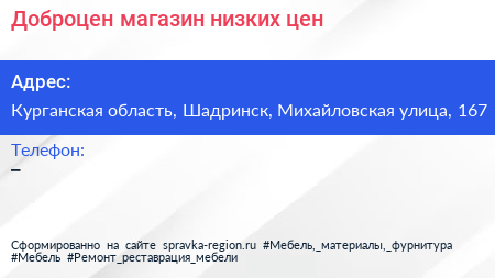 Доброцен, магазин низких цен по адресу Курганская область, Шадринск, Михайловская улица, 167 в дальнейшем Организация, размещена в следующих категориях: