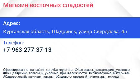 Магазин восточных сладостей по адресу Курганская область, Шадринск, улица Свердлова, 45 в дальнейшем Организация, размещена в следующих категориях: