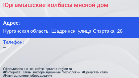 Юргамышские колбасы, мясной дом по адресу Курганская область, Шадринск, улица Спартака, 28 в дальнейшем Организация, размещена в следующих категориях: