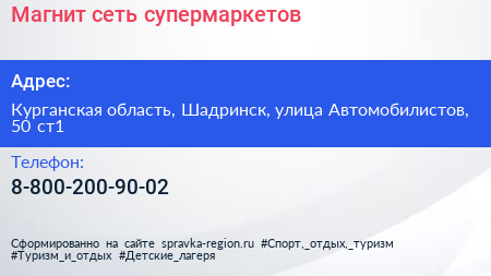 Магнит, сеть супермаркетов по адресу Курганская область, Шадринск, улица Автомобилистов, 50 ст1 в дальнейшем Организация, размещена в следующих категориях: