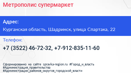 Метрополис, супермаркет по адресу Курганская область, Шадринск, улица Спартака, 22 в дальнейшем Организация, размещена в следующих категориях: