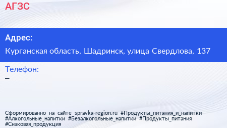 АГЗС по адресу Курганская область, Шадринск, улица Свердлова, 137 в дальнейшем Организация, размещена в следующих категориях: