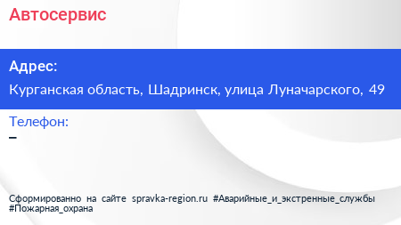 Автосервис по адресу Курганская область, Шадринск, улица Луначарского, 49 в дальнейшем Организация, размещена в следующих категориях: