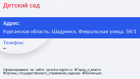 Детский сад по адресу Курганская область, Шадринск, Февральская улица, 58/1 в дальнейшем Организация, размещена в следующих категориях:
