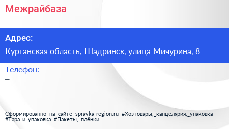 Межрайбаза по адресу Курганская область, Шадринск, улица Мичурина, 8 в дальнейшем Организация, размещена в следующих категориях: