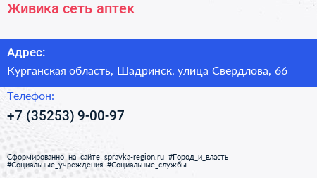 Живика, сеть аптек по адресу Курганская область, Шадринск, улица Свердлова, 66 в дальнейшем Организация, размещена в следующих категориях: