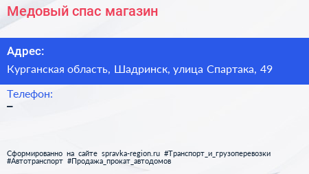 Медовый спас, магазин по адресу Курганская область, Шадринск, улица Спартака, 49 в дальнейшем Организация, размещена в следующих категориях: