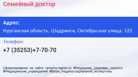 Семейный доктор по адресу Курганская область, Шадринск, Октябрьская улица, 121 в дальнейшем Организация, размещена в следующих категориях: