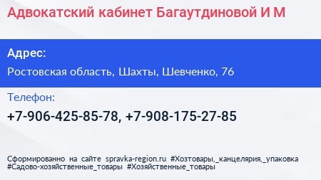 Адвокатский кабинет Багаутдиновой И.М. по адресу Ростовская область, Шахты, Шевченко, 76 в дальнейшем Организация, размещена в следующих категориях:
