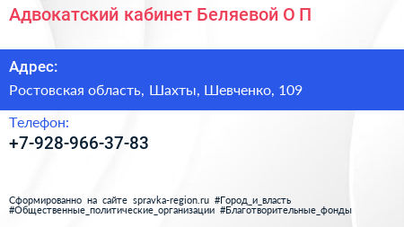 Адвокатский кабинет Беляевой О.П. по адресу Ростовская область, Шахты, Шевченко, 109 в дальнейшем Организация, размещена в следующих категориях: