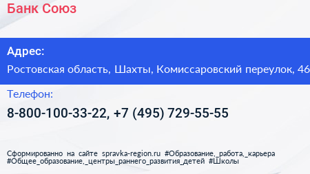 Банк Союз по адресу Ростовская область, Шахты, Комиссаровский переулок, 46 в дальнейшем Организация, размещена в следующих категориях:
