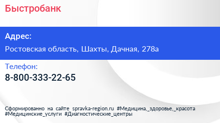 Быстробанк по адресу Ростовская область, Шахты, Дачная, 278а в дальнейшем Организация, размещена в следующих категориях:
