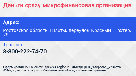 Деньги сразу, микрофинансовая организация по адресу Ростовская область, Шахты, переулок Красный Шахтёр, 78 в дальнейшем Организация, размещена в следующих категориях: