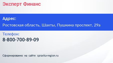 Эксперт Финанс по адресу Ростовская область, Шахты, Пушкина проспект, 29а в дальнейшем Организация, размещена в следующих категориях: