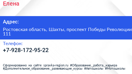 Елена по адресу Ростовская область, Шахты, проспект Победы Революции, 111 в дальнейшем Организация, размещена в следующих категориях: