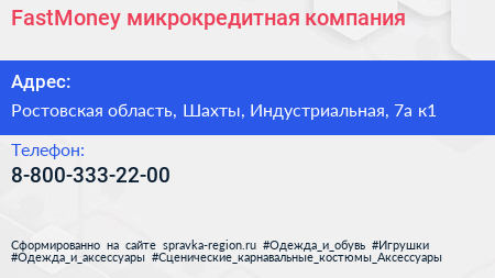 FastMoney, микрокредитная компания по адресу Ростовская область, Шахты, Индустриальная, 7а к1 в дальнейшем Организация, размещена в следующих категориях: