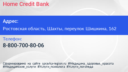 Home Credit Bank по адресу Ростовская область, Шахты, переулок Шишкина, 162 в дальнейшем Организация, размещена в следующих категориях:
