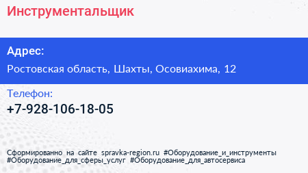 Инструментальщик по адресу Ростовская область, Шахты, Осовиахима, 12 в дальнейшем Организация, размещена в следующих категориях: