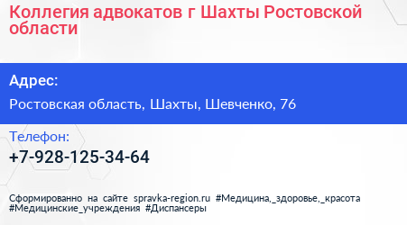 Коллегия адвокатов г. Шахты Ростовской области по адресу Ростовская область, Шахты, Шевченко, 76 в дальнейшем Организация, размещена в следующих категориях: