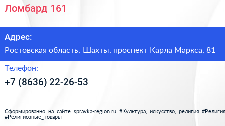 Ломбард 161 по адресу Ростовская область, Шахты, проспект Карла Маркса, 81 в дальнейшем Организация, размещена в следующих категориях: