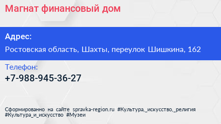 Магнат, финансовый дом по адресу Ростовская область, Шахты, переулок Шишкина, 162 в дальнейшем Организация, размещена в следующих категориях: