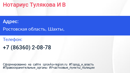 Нотариус Тулякова И.В. по адресу Ростовская область, Шахты, в дальнейшем Организация, размещена в следующих категориях: