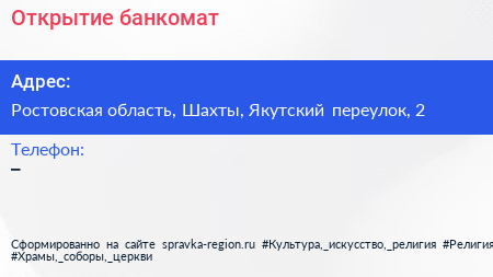 Открытие, банкомат по адресу Ростовская область, Шахты, Якутский переулок, 2 в дальнейшем Организация, размещена в следующих категориях: