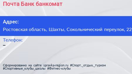 Почта Банк, банкомат по адресу Ростовская область, Шахты, Сокольнический переулок, 22 в дальнейшем Организация, размещена в следующих категориях:
