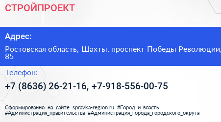 СТРОЙПРОЕКТ по адресу Ростовская область, Шахты, проспект Победы Революции, 85 в дальнейшем Организация, размещена в следующих категориях: