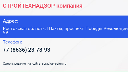 СТРОЙТЕХНАДЗОР, компания по адресу Ростовская область, Шахты, проспект Победы Революции, 59 в дальнейшем Организация, размещена в следующих категориях: