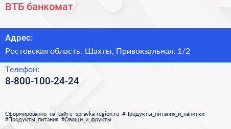 ВТБ, банкомат по адресу Ростовская область, Шахты, Привокзальная, 1/2 в дальнейшем Организация, размещена в следующих категориях: