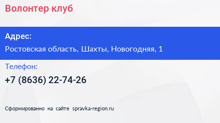 Волонтер, клуб по адресу Ростовская область, Шахты, Новогодняя, 1 в дальнейшем Организация, размещена в следующих категориях: