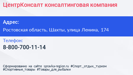 ЦентрКонсалт, консалтинговая компания по адресу Ростовская область, Шахты, улица Ленина, 174 в дальнейшем Организация, размещена в следующих категориях: