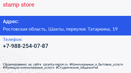 stamp-store по адресу Ростовская область, Шахты, переулок Татаркина, 19 в дальнейшем Организация, размещена в следующих категориях:
