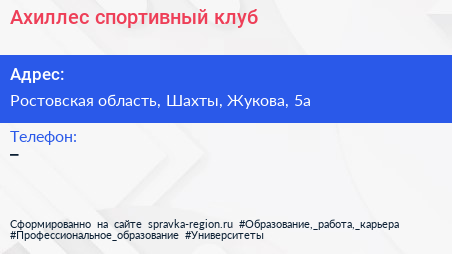 Ахиллес, спортивный клуб по адресу Ростовская область, Шахты, Жукова, 5а в дальнейшем Организация, размещена в следующих категориях: