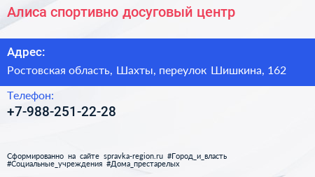 Алиса, спортивно-досуговый центр по адресу Ростовская область, Шахты, переулок Шишкина, 162 в дальнейшем Организация, размещена в следующих категориях: