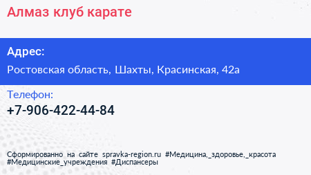 Алмаз, клуб карате по адресу Ростовская область, Шахты, Красинская, 42а в дальнейшем Организация, размещена в следующих категориях: