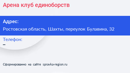 Арена, клуб единоборств по адресу Ростовская область, Шахты, переулок Булавина, 32 в дальнейшем Организация, размещена в следующих категориях: