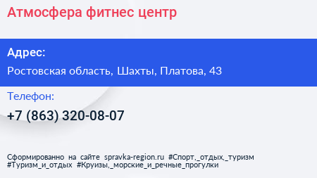 Атмосфера, фитнес-центр по адресу Ростовская область, Шахты, Платова, 43 в дальнейшем Организация, размещена в следующих категориях: