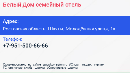 Белый Дом, семейный отель по адресу Ростовская область, Шахты, Молодёжная улица, 1а в дальнейшем Организация, размещена в следующих категориях: