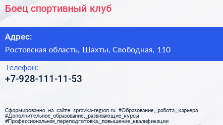 Боец, спортивный клуб по адресу Ростовская область, Шахты, Свободная, 110 в дальнейшем Организация, размещена в следующих категориях: