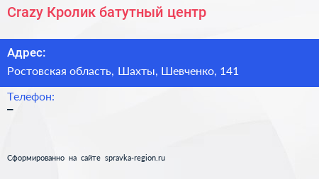 Crazy Кролик, батутный центр по адресу Ростовская область, Шахты, Шевченко, 141 в дальнейшем Организация, размещена в следующих категориях: