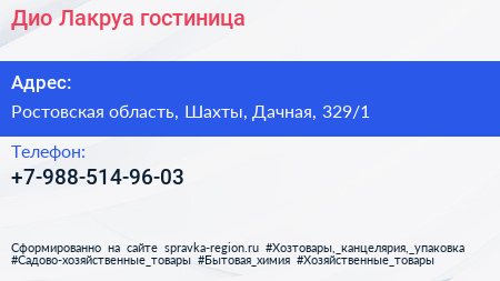 Дио Лакруа, гостиница по адресу Ростовская область, Шахты, Дачная, 329/1 в дальнейшем Организация, размещена в следующих категориях: