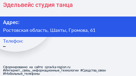 Эдельвейс, студия танца по адресу Ростовская область, Шахты, Громова, 61 в дальнейшем Организация, размещена в следующих категориях: